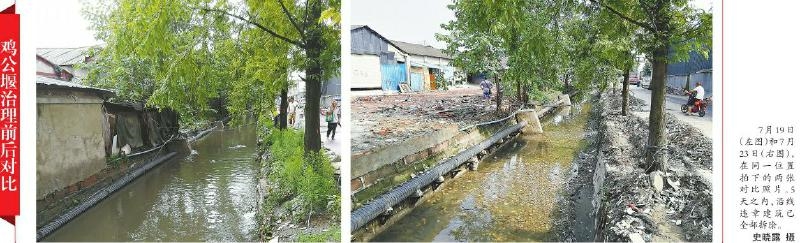 治理后:鸡公堰沿岸侵占河道的违章建筑全部被拆除,住户搬走了,河里垃圾也少了,河道亮出“真身”□史晓露 本报记者 蒋君芳